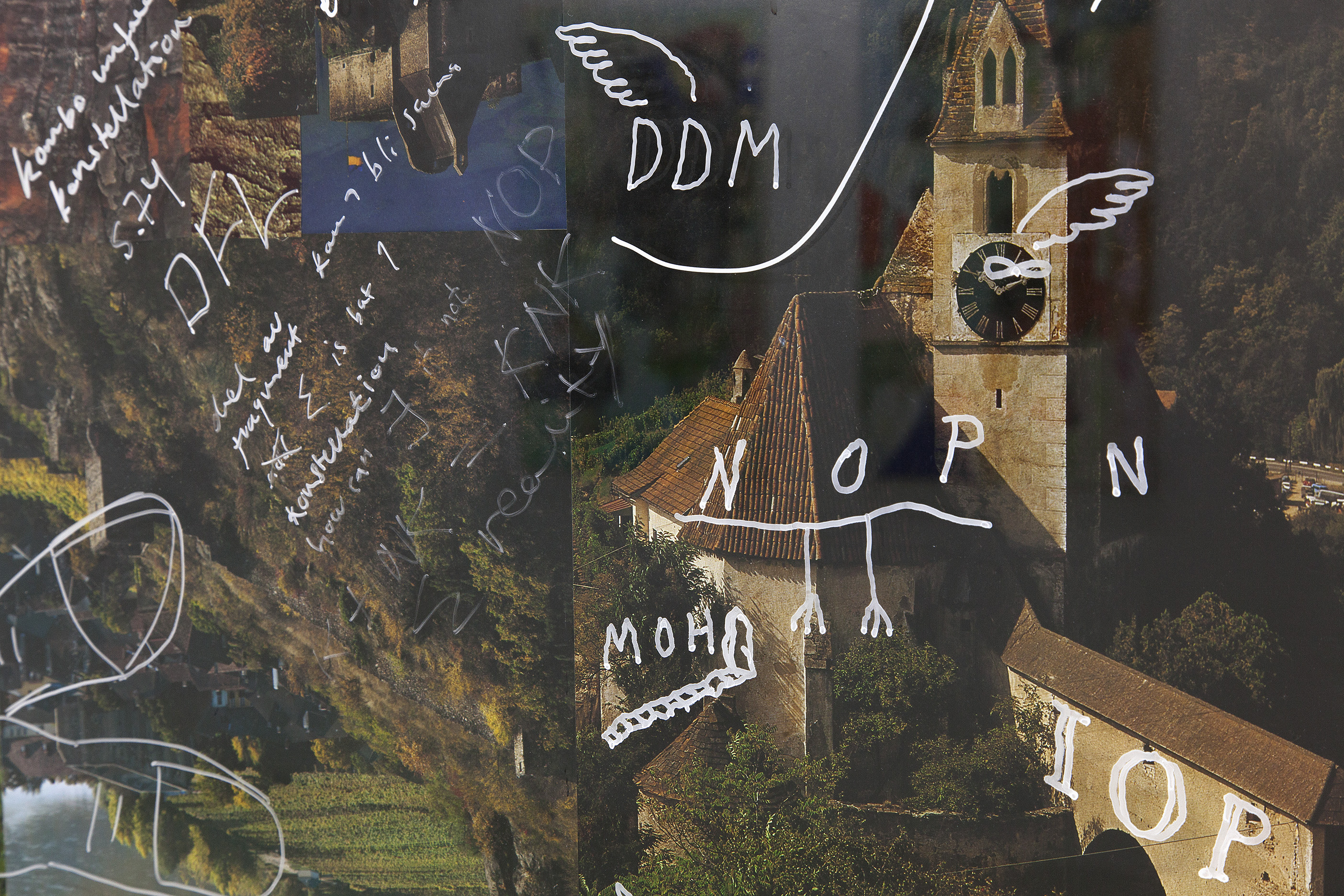 Collage windows I & II : collage on board, Plexiglas, green play felt window sill, chalk pens, dice cups, letter dice & cards, play pieces of various sizes & materials, books & texts from other worlds.