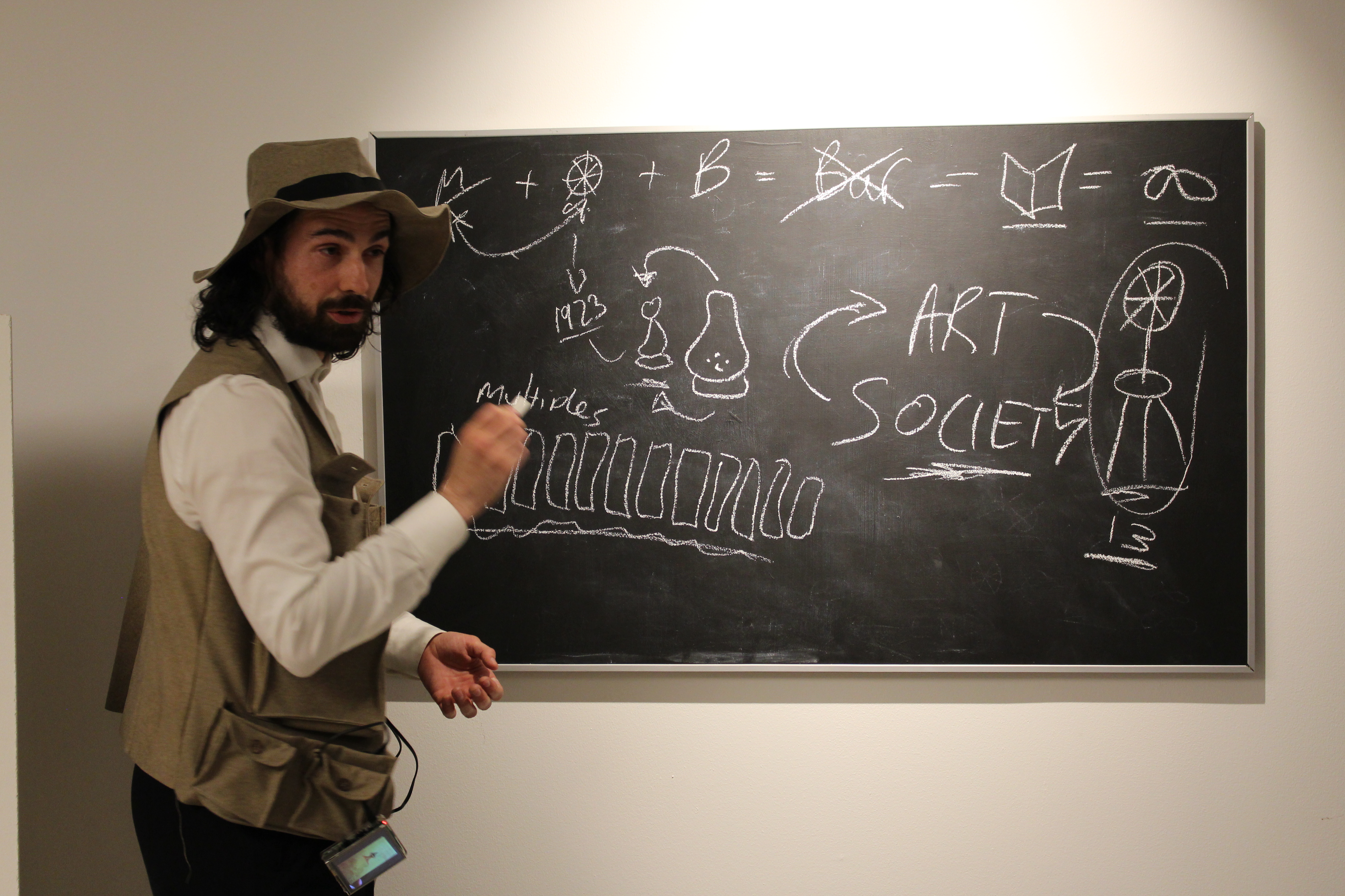 A performance lecture about Art, Society, Infinity and angry dead men. ‘Untitled’ is a conversation and argument that never occurred between three famous male egos: Joseph Beuys, Marcel Duchamp and Jorge Luis Borges. They are trapped in an infinite library discussing Society and Art and trying to save the world from AI.